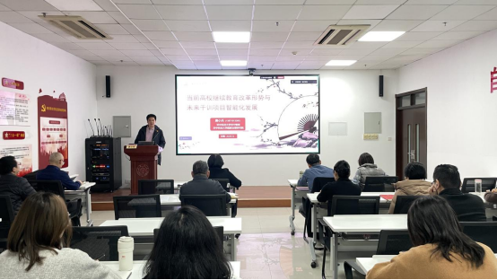 为准确把握高校继续教育发展动向,推动培训工作创新发展,12月23日下午,继续教育学院举办职工能力提升专题培训(第二期)。本次培训特邀华中科技大学华中智库(国家治理研究院)培训中心主任、航星永志AI干部教育研究院(特聘)院长唐小兵主讲。副院长周明华主持培训会,学院全体教职工参加学习。