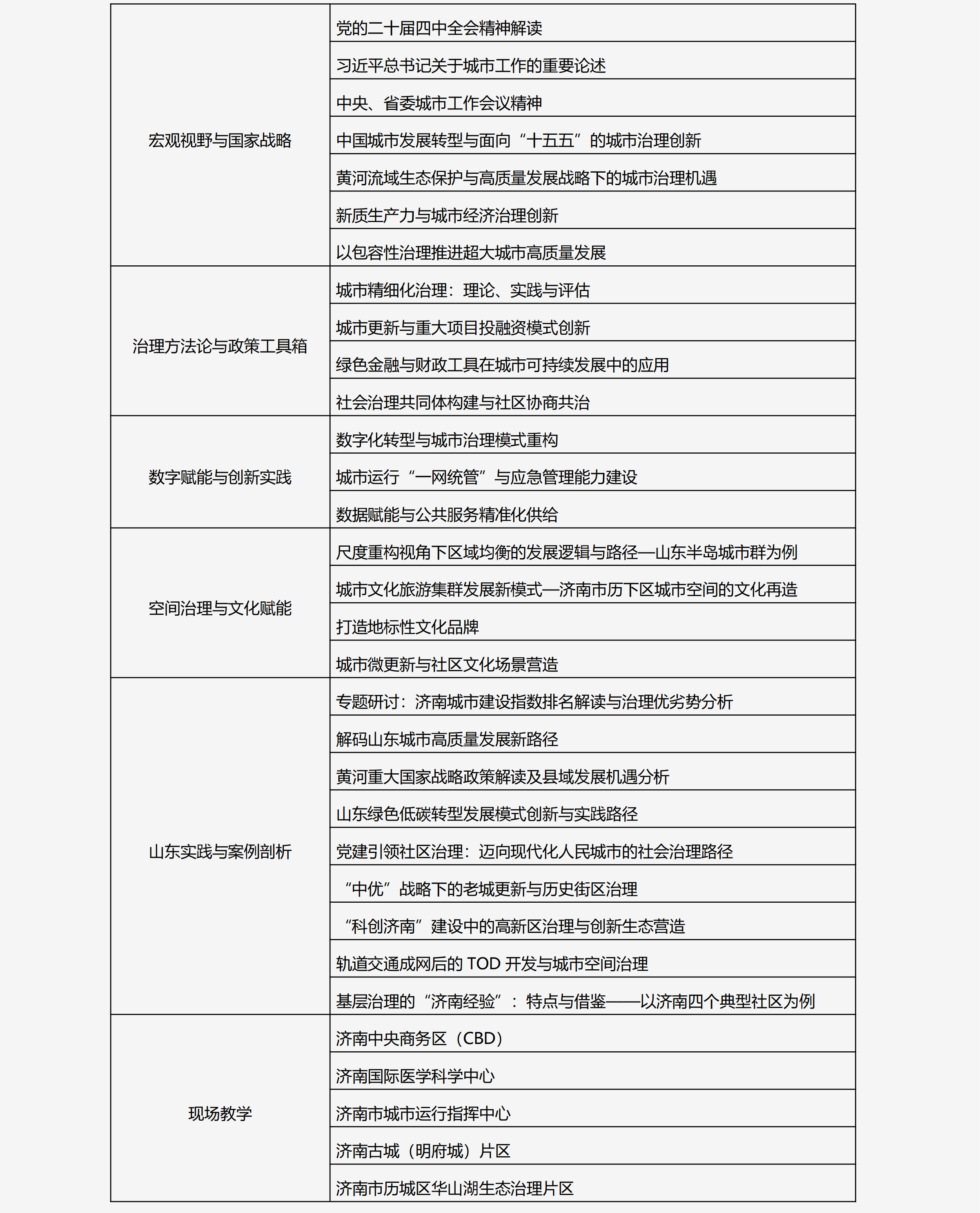 为深入贯彻2025年中央城市工作会议精神及《中共中央 国务院关于推动城市高质量发展的意见》,落实党的二十届四中全会关于“推进国家治理体系和治理能力现代化”的战略部署,应对城市发展向“存量提质增效”的转型变革,山东大学充分发挥综合性大学的学科与智库优势,特设计本培训专题。专题聚焦“城市治理体系与治理能力现代化”核心主题,以国家战略为引领,以真实治理难题为导向,系统解析现代城市治理的理论框架、制度设计与实践工具,同时深度融合前沿政策理论与一线创新经验。专题将紧密结合济南市等先进城市的创新实践进行深度剖析。以济南为例,其在《城市综合发展指数报告(2025年)》中位列全国第五的成绩,正是治理体系现代化的生动体现。专题将系统解构其在协同治理格局建设、数字化治理能力提升、风险应急管理强化与社会多元共治等方面的制度创新与实践探索,着力提炼可复制、可推广的“治理现代化”经验。最终,旨在为参训领导干部全面提升城市规划、建设与治理的系统性能力,扎实推动城市高质量发展提供坚实的理论武装与实践指南。
