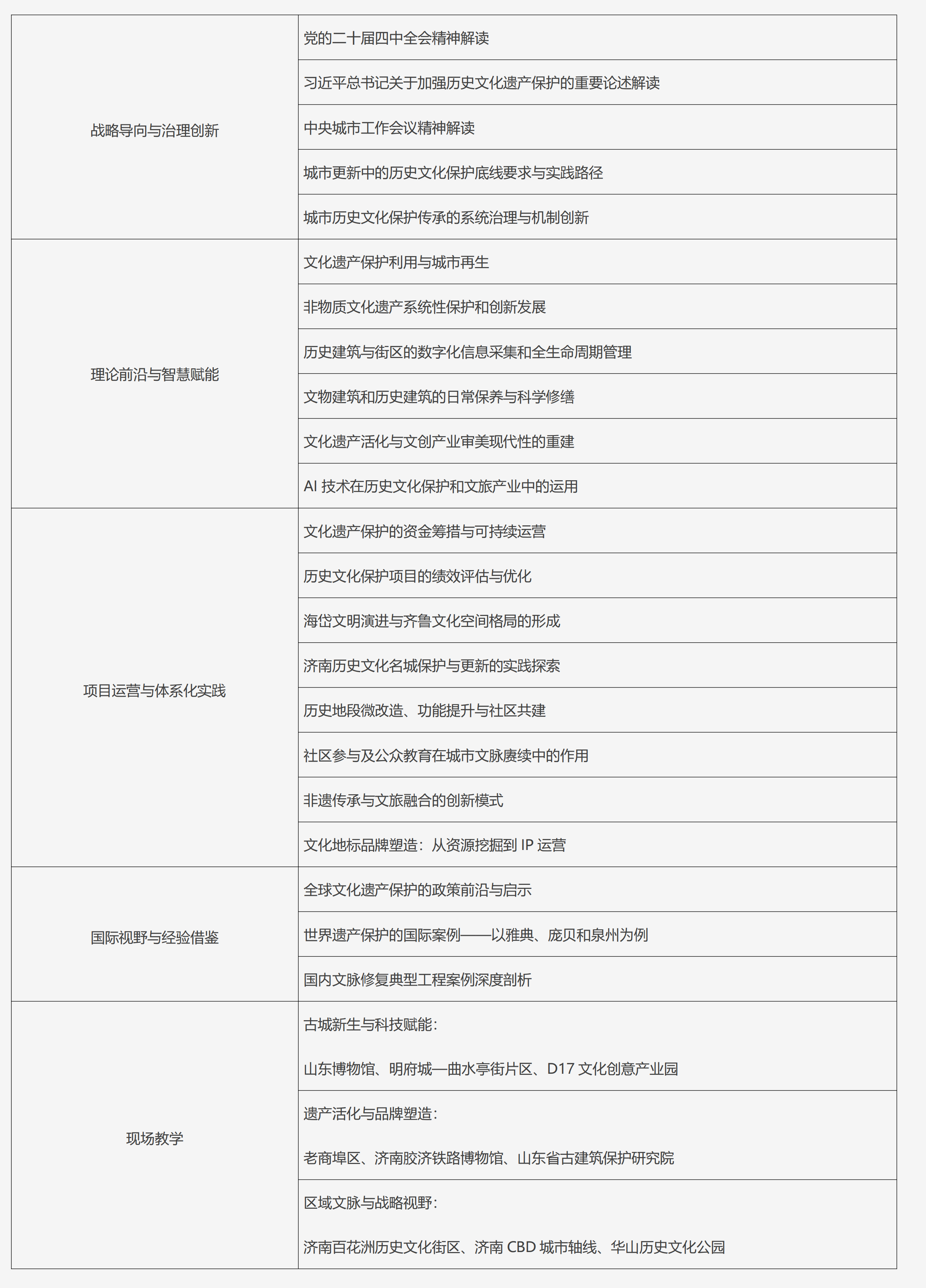 为贯彻落实习近平总书记关于城市工作和历史文化保护传承的重要指示精神,大力推动城市文脉赓续,在当前以城市更新推动城市高质量发展的进程中,切实处理好城市改造开发与历史文化遗产保护利用的关系,做到“在保护中发展、在发展中保护”,山东大学依托深厚的学科积淀与高端智库平台优势特设计本专题。专题通过设置系统的政策解读、理论前沿探讨等精品课程,同时深度融入济南等城市在名城保护与非遗活化等方面的实践案例,旨在培养兼具国际视野与实操能力的管理和专业人才,服务区域文化战略,为赓续城市文脉、推动城市高质量发展提供坚实的人才与智力支撑。